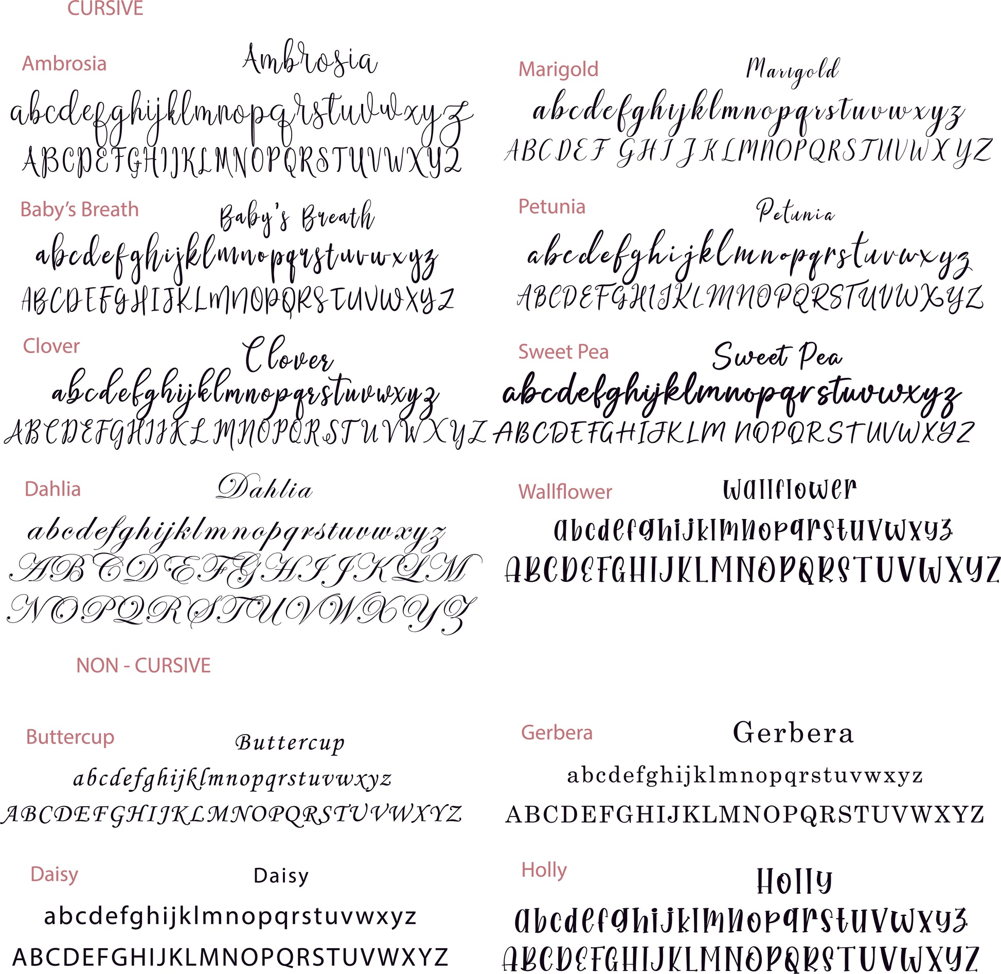 * AT CHECKOUT - PLEASE INDICATE WHAT COLOUR AND FONT YOU WOULD LIKE TO USE UNDER 'ORDER SPECIAL INSTRUCTIONS' *